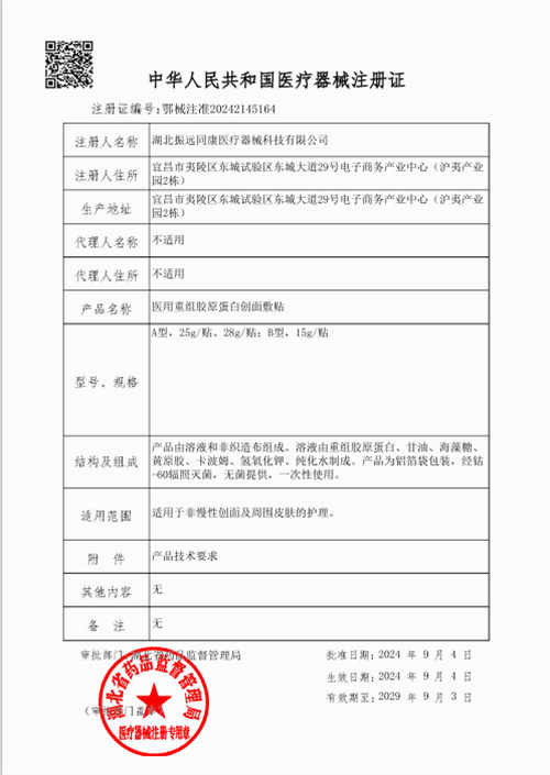 9月4日,湖北振遠(yuǎn)同康醫(yī)療器械科技有限公司正式收到省藥品監(jiān)督管理局核發(fā)的醫(yī)用重組膠原蛋白創(chuàng)面敷貼注冊證書,編號(hào)為:鄂械注準(zhǔn)20242145164,標(biāo)志著該企業(yè)加快臨床產(chǎn)品研發(fā)取得新突破。至此,該企業(yè)已擁有5個(gè)二類醫(yī)療器械產(chǎn)品注冊證。