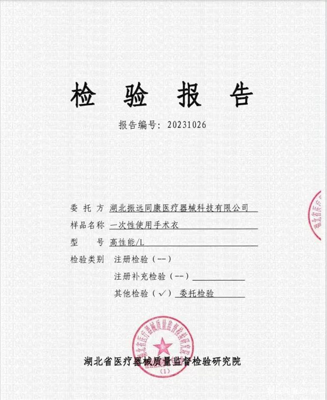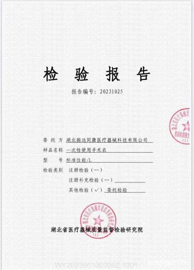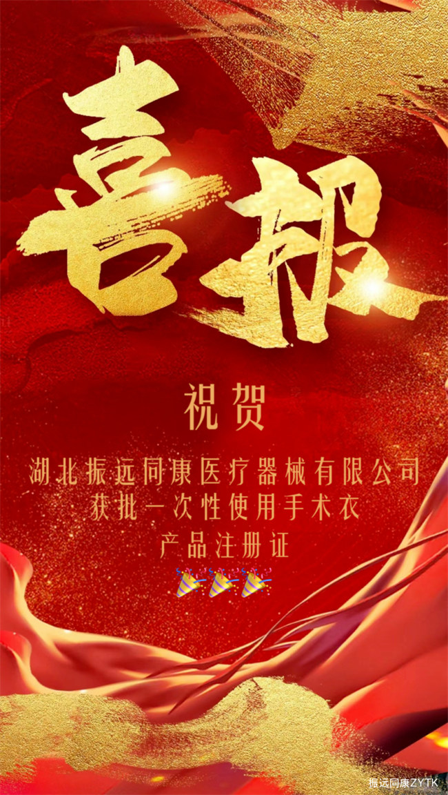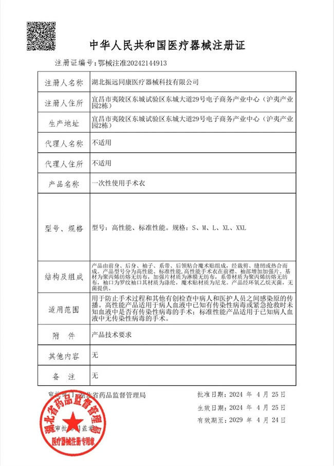 湖北振遠同康醫(yī)療器械科技有限公司旗下的產(chǎn)品“一次性使用手術衣”歷經(jīng)數(shù)月喜獲國家二類醫(yī)療器械注冊證!注冊證編號:鄂械注準20242144913