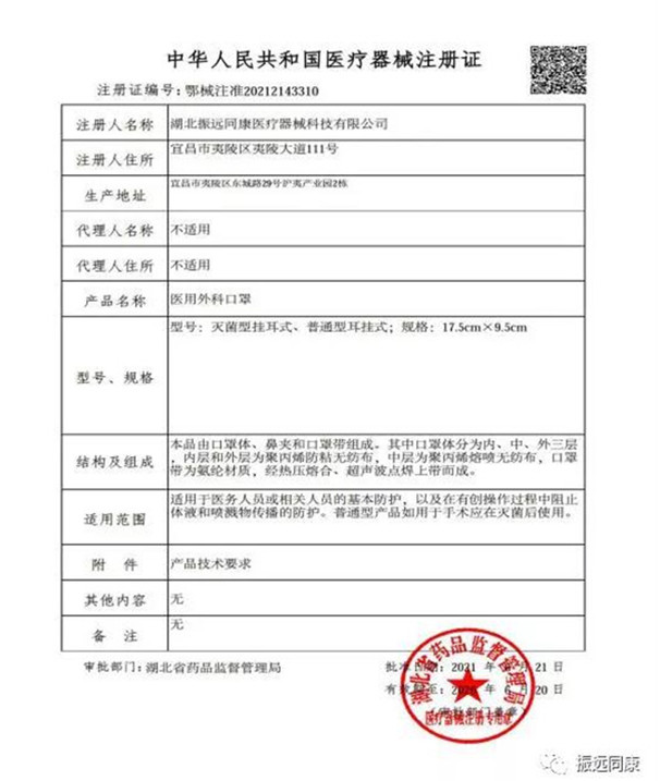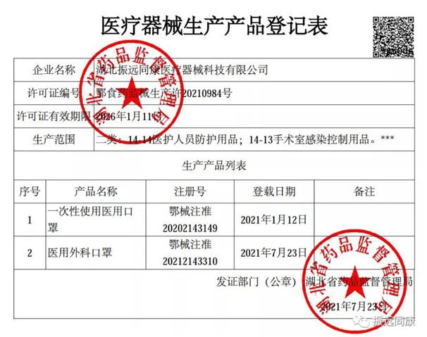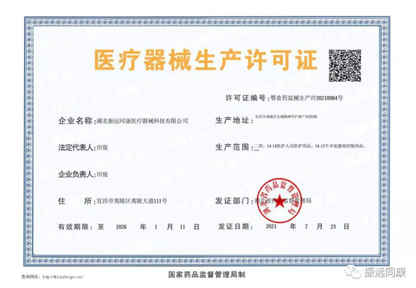近日,湖北省藥品監(jiān)督管理局審核批準(zhǔn)了由湖北振遠(yuǎn)同康醫(yī)療器械科技有限公司申請注冊的醫(yī)用外科口罩產(chǎn)品。至此,經(jīng)過一年時間籌備,湖北振遠(yuǎn)同康醫(yī)療已成功具備一次性醫(yī)用口罩普通型、滅菌型,醫(yī)用外科口罩普通型、滅菌型生產(chǎn)資質(zhì),日產(chǎn)能力可達(dá)10萬片。